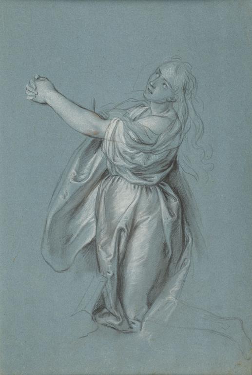 Pierre noire, traces de sanguine, estompe et rehauts de blanc sur papier bleu 40,4 x 30,5 cm